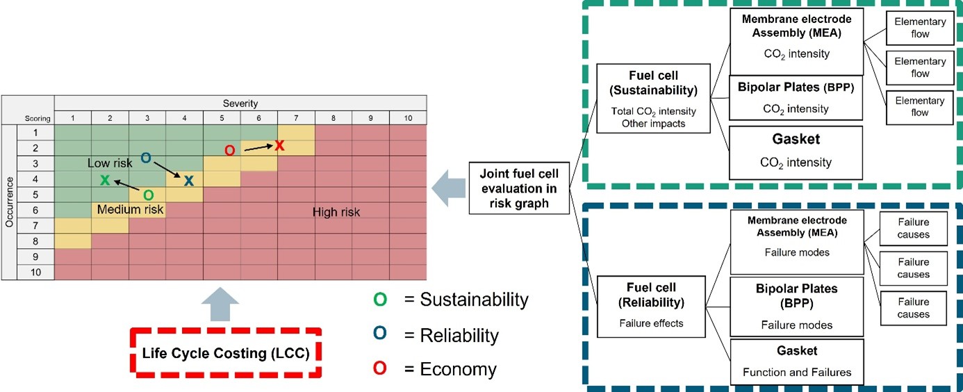 Beispielhaft an einer Brennstoffzelle wurde der Zusammenhang zwischen Nachhaltigkeit, Zuverlässigkeit und Kosten analysiert. Als Ausgangspunkt diente die Vorgehensweise der grafischen Fehlermöglichkeits- und Einflussanalyse (FMEA), welche systematisch um die Attribute der Nachhaltigkeit und Kosten erweitert wurde.
